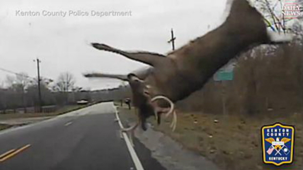 켄터키주(州) 켄톤 카운티 경찰 당국은 도로를 순찰 중이던 경찰차 앞으로 갑자기 뛰어나온 큰 사슴 한 마리가 부딪히는 장면을 담은 영상을 페이스북을 통해 공개했다.