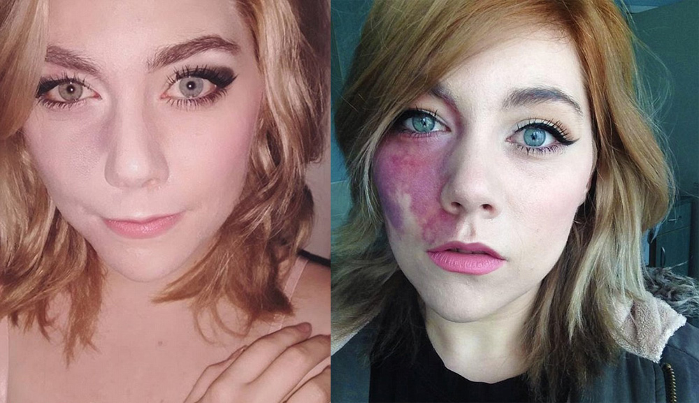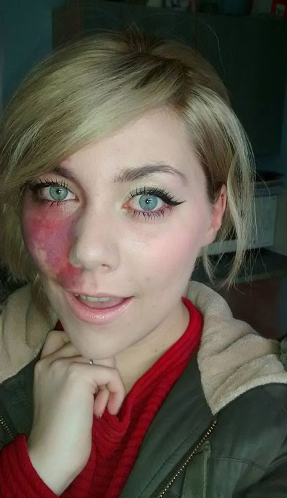 한쪽 얼굴을 덮은 빨간 반점을 화장으로 감추고 살던 한 영국 여성이 SNS에 공개적으로 자신의 ‘약점’을 드러내면서 화제가 되고 있다.