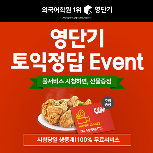 영단기 조세원 부대표는 “토익 시험을 위해 열심히 달려온 토익 수험생들을 위해 영단기가 다양한 이벤트를 준비했다”며 ”토익 풀 서비스를 시청하며 토익정답 및 당일 논란 문제 확인도 하고 바나나우유, CGV영화 관람권, BHC후라이드치킨 등 영단기가 준비한 선물도 받아가길 바란다”고 말했다.