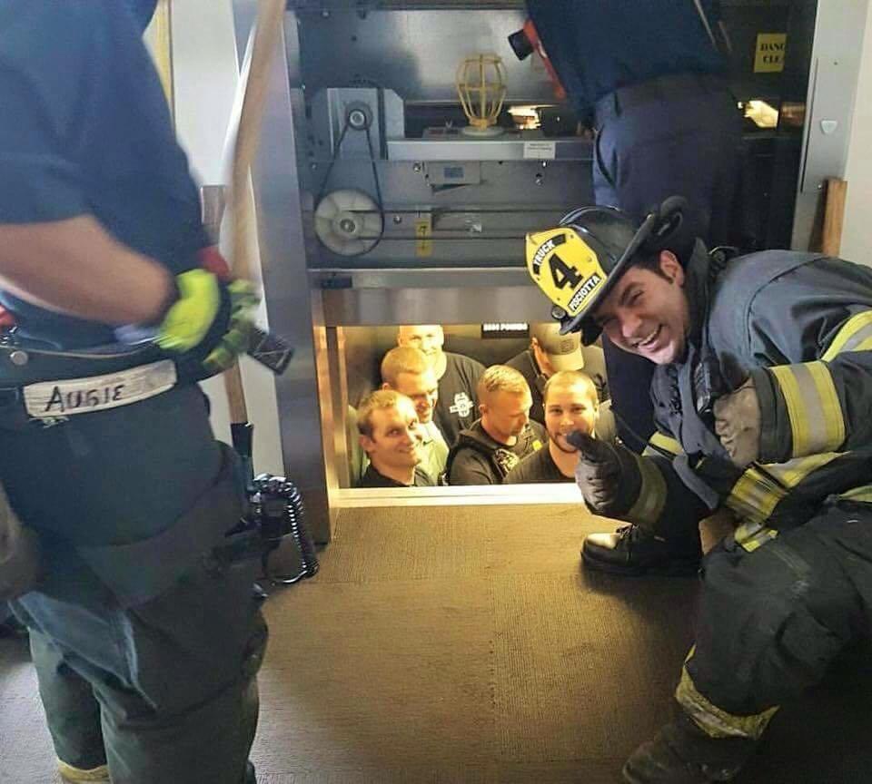 미국 캔자스 시티 경찰은 지난달 28일(이하 현지시간) 공식 페이스북에 해당 사진을 공개하고 그달 27일 오후 1시쯤 캔자스 시티 경찰학교에 있는 엘리베이터가 고장이 나 안에 타고 있던 경찰관들이 소방관들에게 구출됐다고 전했다.