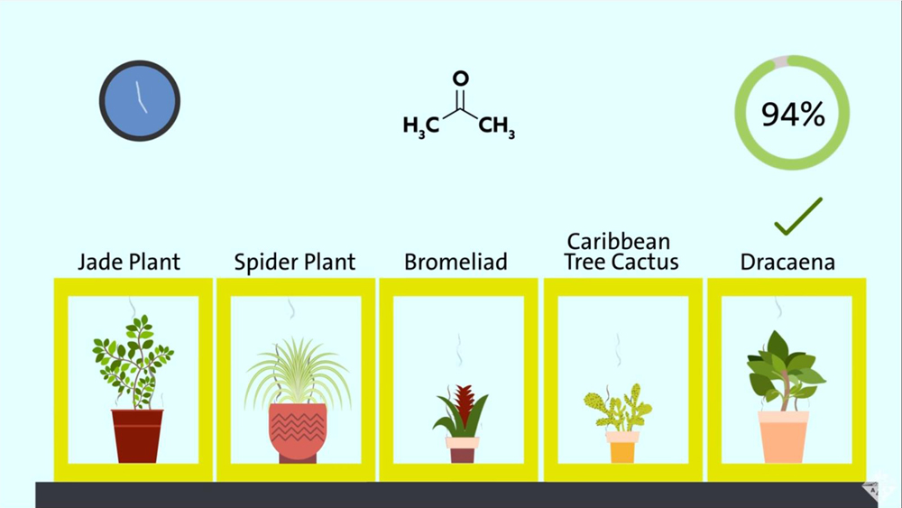 그 결과, 5종의 식물 모두 아세톤을 흡수했으며 이 중에서도 드라세나가 아세톤의 94%를 제거하는 가장 큰 효과를 보였다.