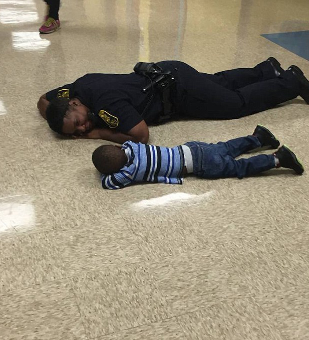 바닥에 엎드려 서로를 쳐다보는 이 사진은 지난 26일 지역 내 공립학교에서 촬영된 것이다. 이날 용무가 있어 학교를 찾은 코너-존스 경관은 복도를 지나다 우연히 바닥에 엎드려 울고있는 한 소년을 발견했다. 친구들과 싸웠는지 아니면 속상한 일이 있었는지 모르지만 4살 또래의 소년이라면 흔히 할 수 있는 행동.