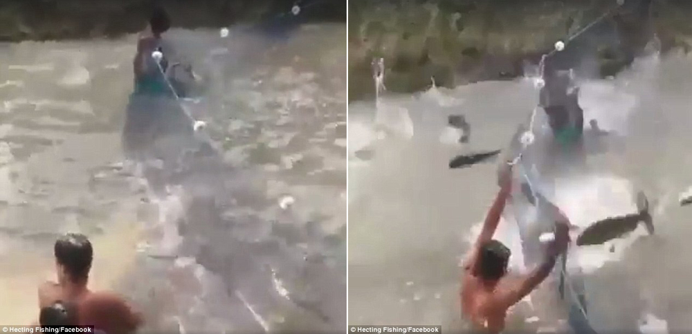 엄청난 물고기 떼의 폭격에 결국 두 남성은 들고 있던 그물을 놓치고 만다.