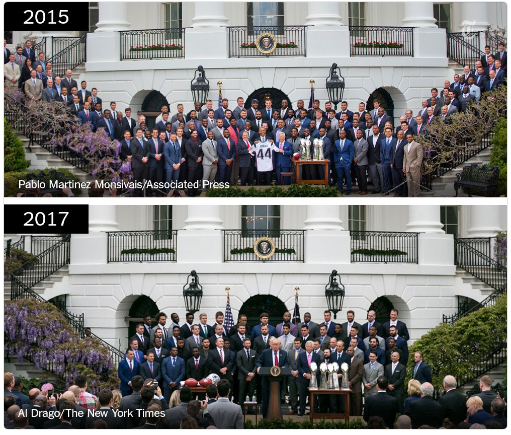 슈퍼볼 챔피언 구단을 백악관에 초청하는 것은 미국 대통령의 오랜 전통이다. 2년 전 당시 슈퍼볼 우승팀도 패트리어츠로 올해와 가장 큰 차이는 참가한 사람 숫자가 사진 속에서 달라 보인다는 사실이다. 2년 전 촬영된 사진에는 연단 위로 사람들이 가득차 있으나 올해 사진에는 한눈에 봐도 적어 보인다. 뉴욕타임즈는 트위터에 두 사진을 비교만 해놓았을 뿐 별다른 코멘트를 달지 않았지만 의미는 명확했다.