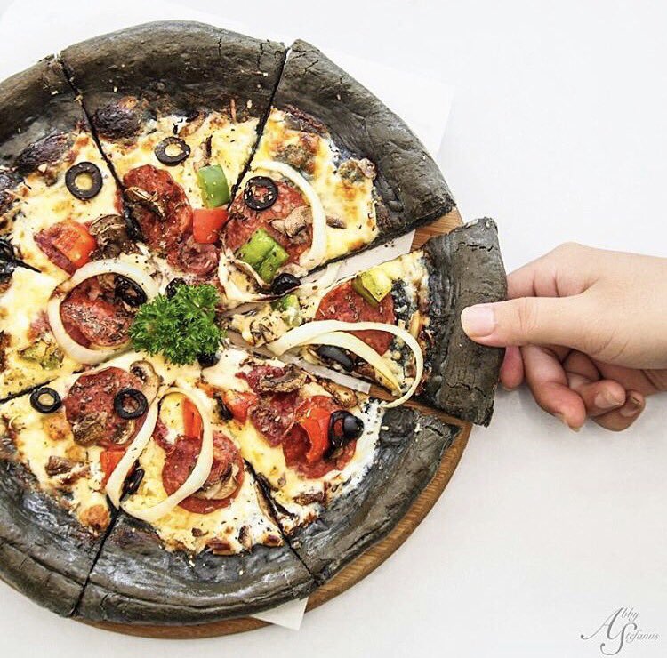 시커먼 피자는 그냥 태웠다거나 요리사가 피자 도우에 잿더미를 더해 만든 것처럼 들리지도 모르지만 그런 경우는 아니다. 피자를 검게 만드는 주인공은 오징어 먹물이 아닌 ‘활성탄’. 활성탄을 피자 가루 반죽에 넣어 구웠다. 음식물 재료로 활성탄이 근래에 점점 인기를 얻으면서 피자의 부가 재료로도 톡톡한 역할을 하는 중이다.