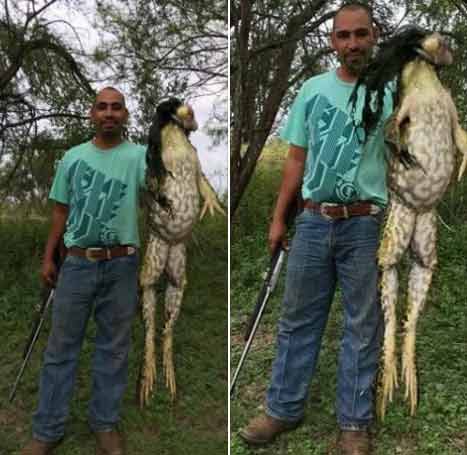 지난 25일(현지시간) 사우스 텍사스 사냥협회 페이스북을 통해 공개된 이 사진에는 한 남자가 자신만한 길이의 황소개구리를 들고있는 모습이 담겨있다. 사냥협회 측은 "낚시터 인근에서 잡은 괴물같은 황소개구리"라면서 "몸무게가 무려 5.9kg에 달한다"고 밝혔다.