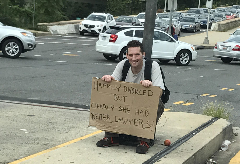 아무래도 이 남성은 이혼을 위한 위자료 소송에서 패소해 재산을 몽땅 잃고 노숙인이 돼 버린 듯하다.