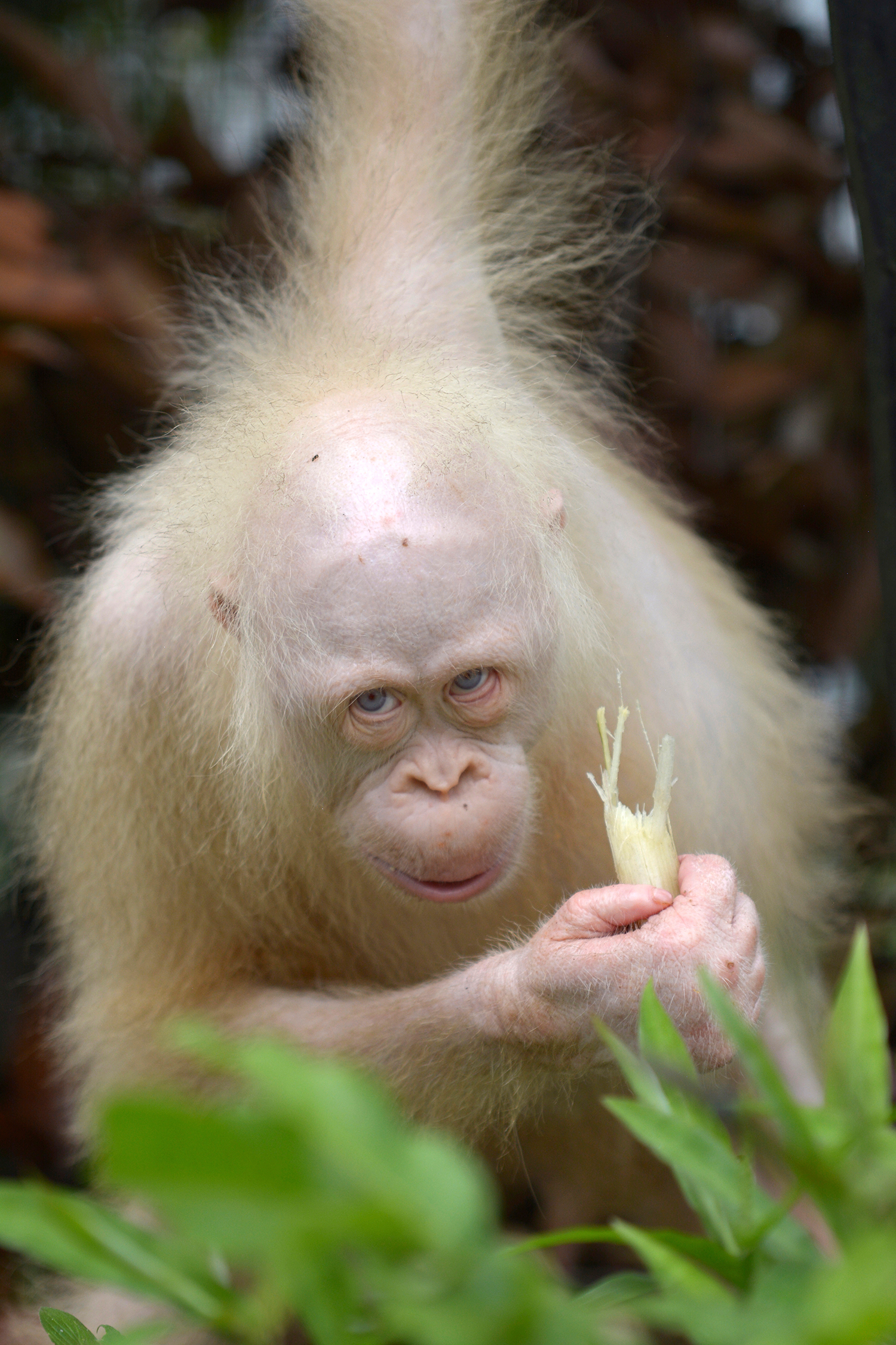 말리이제도의 보르네오섬에 사는 알비노 오랑우탄 ‘알바’(5)는 어렸을 때 인도네시아의 동물호보단체인 ‘보르네오오랑우탄생존재단’(Borneo Orangutan Foundation)에 의해 구조된 뒤 현재까지 보호를 받고 있다. 알비노는 멜라닌 세포에서의 멜라닌 합성이 결핍되는 선천성 유전질환으로, 사람을 포함한 동물 전반에서 드물게 나타난다.