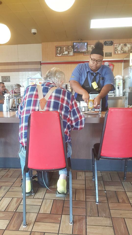 윌리엄스는 그런 그에게 다가가 접시 위의 음식을 잘게 잘라주었다. 이 모습을 지켜보고 있던 또 다른 고객 로라 울프는 그녀의 세심한 배려에 감동해 그 순간을 사진으로 찍었다. 그리고 그 사진을 “우리도 그녀처럼 될 수 있다. 도움의 손길을 건네는데 시간을 낼 수 있다”는 글과 함께 자신의 페이스북에 올렸다.