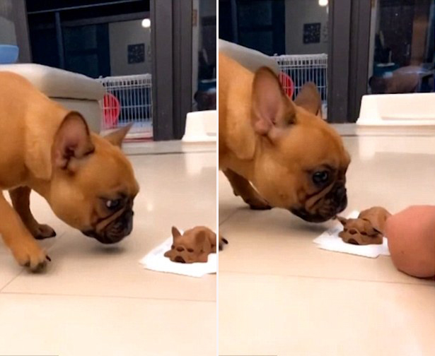 영상에는 호기심 많은 프렌치 불독이 등장했다. 불독은 주인이 가져온 강아지 모양의 케이크를 발견하고 신기한 듯 냄새를 맡으면서 조심스레 케이크 표면을 핥았다.