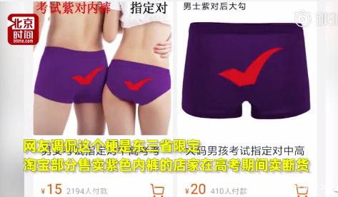 타오바오의 일부 쇼핑몰에서는 가오카오 전부터 보라색 팬티가 품절 사태를 빚기도 했다. 한 쇼핑몰 업주는 “시험 기간 보라색 속옷을 수백장 팔았다”고 전했다.