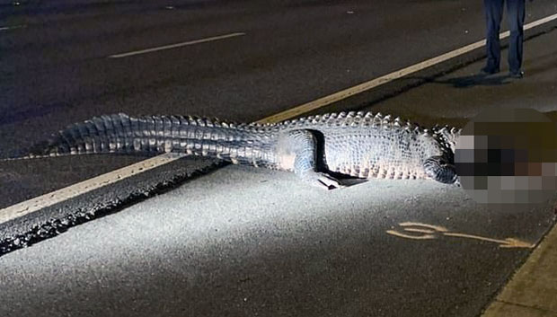 이번에 목격된 악어도 길이 3.6m로 덩치가 제법 크다. 악어를 수습하기 위해 현장으로 출동한 악어 사냥꾼 브로데릭 본은 “처음에는 고속도로 순찰차들 때문에 악어의 크기를 가늠할 수 없었다. 가까이 가보니 지난 10년간 내가 본 악어 중 손에 꼽을 정도로 덩치가 컸다”고 설명했다. 길이 4m에 육박하는 이 악어는 그러나 도로를 지나던 소형 트럭과 충돌해 부상을 입었다. 사냥꾼 본과 함께 악어를 옮겨 부상 정도를 확인한 고속도로 순찰대는 트럭에 치인 악어의 두개골 골절이 생각보다 심각해 안락사 처리할 수밖에 없었다고 밝혔다.