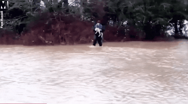 지난 주말동안 영국에 상륙한 태풍 ‘데니스’의 영향으로 곳곳에서 홍수로 인한 피해가 이어진 가운데, 더비셔의 한 농장에서 일하는 파예 러셀(26)은 반려견과 함께 홍수로 물에 잠긴 강가를 바라보던 중 이웃의 외침을 들었다.