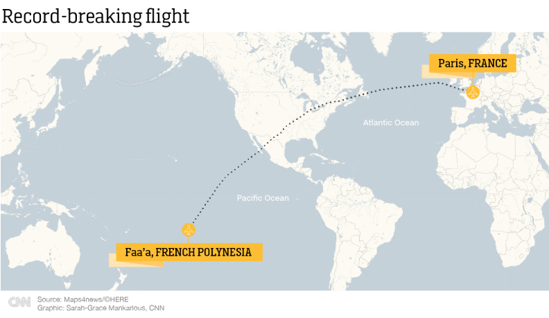 보도에 따르면, 에어타히티누이 TN064편은 지난 14일 남태평양의 프랑스령 타히티섬 파페테를 출발해 태평양과 대서양을 가로질러 프랑스 파리 샤를드골 공항까지 9765마일(약 1만5700㎞)을 비행했다. 정기편 여객기로는 사상 최장 비행거리를 기록한 것이다.