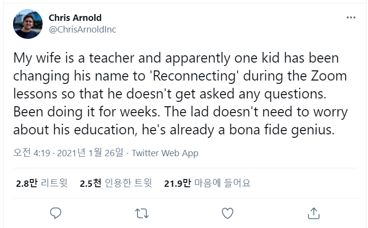 브리스틀에 사는 DJ 겸 라디오 진행자 크리스 아널드는 지난 26일(현지시간) 트위터에서 “내 아내는 교사인데, 한 학생이 줌(온라인) 수업 시간에 질문을 받지 않으려고 이름을 ‘리커넥팅’(Reconnecting·재접속중)으로 바꾼 것 같다. 이미 몇 주째 이런 상태에 있다”고 밝혔다. 이어 “이 소년은 교육에 대해 아무것도 걱정할 필요가 없을 것 같다. 이미 진짜 천재이기 때문”이라고 덧붙였다.
