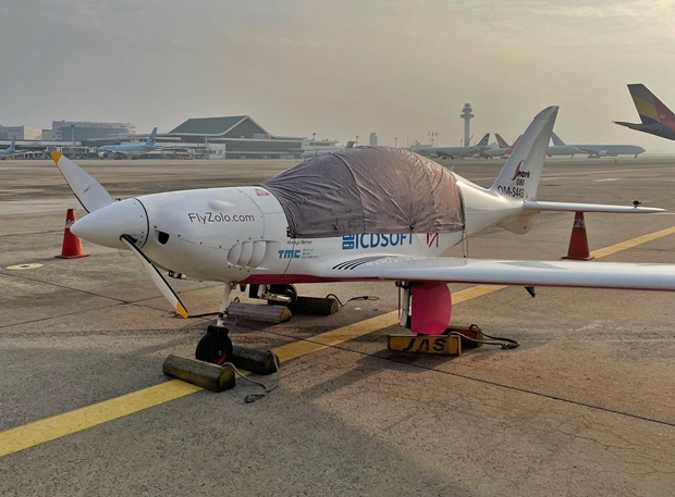 ▲ 최연소 여성으로서 세계일주 단독비행에 도전 중인 벨기에·영국 국적의 자라 러더포드의 경비행기가 11일 오후 서울 김포공항에 착륙해 있다./자라 러더포드 페이스북