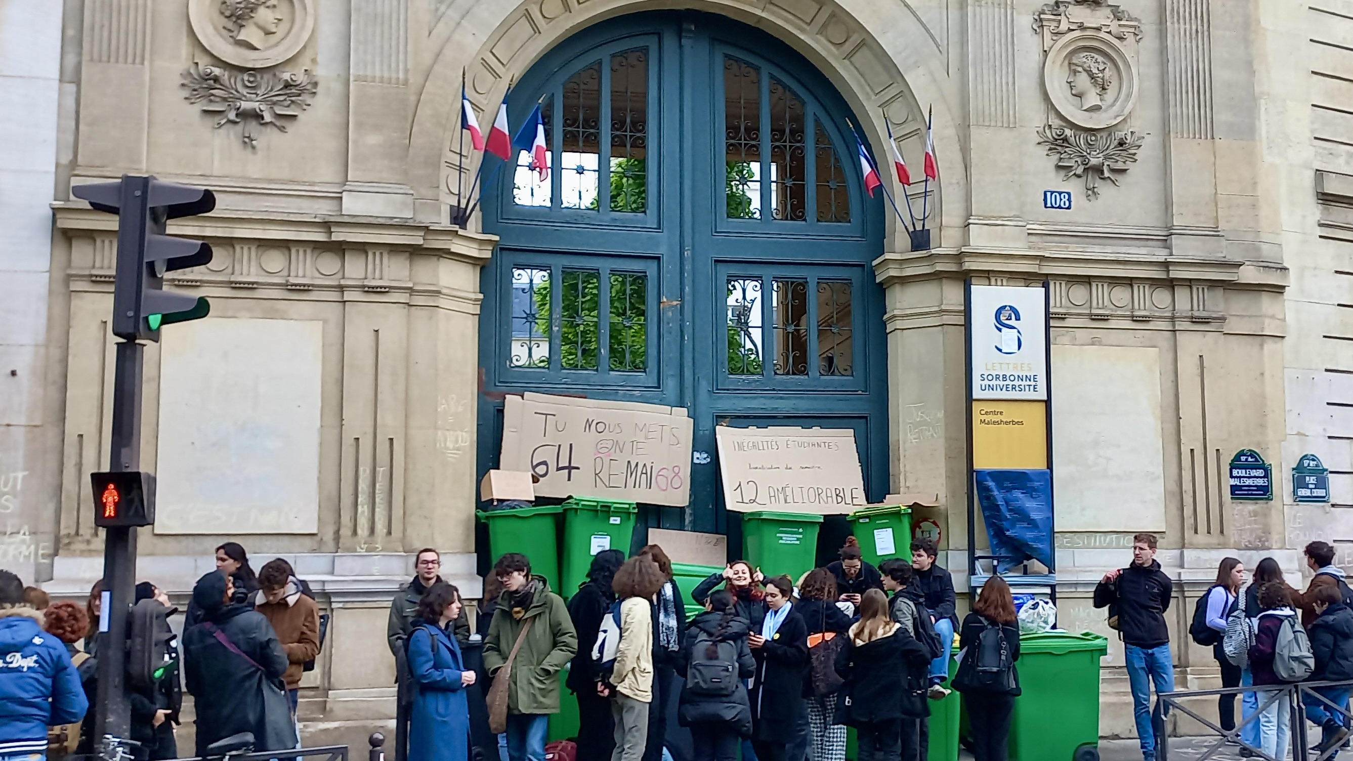 플래카드에는 '64세 정년을 연장한다면 5월 혁명으로 답하겠다'정문 앞을 메운 초록색 쓰레기통 위에는 큰 글씨의 플래카드가 걸렸다. ‘당신이 64세 정년을 준다면, 우리는 5월 혁명으로 답하겠다.’(Tu nous mets 64, on te Mai 68!) 이는 1968년도 5월에 일어났던 '68운동' 혹은 '5월 혁명'으로 불리는 사건을 상기시키는 문구로 파리 근교 낭테르 대학에서 일어난 학생운동이 그 시발점이었다.