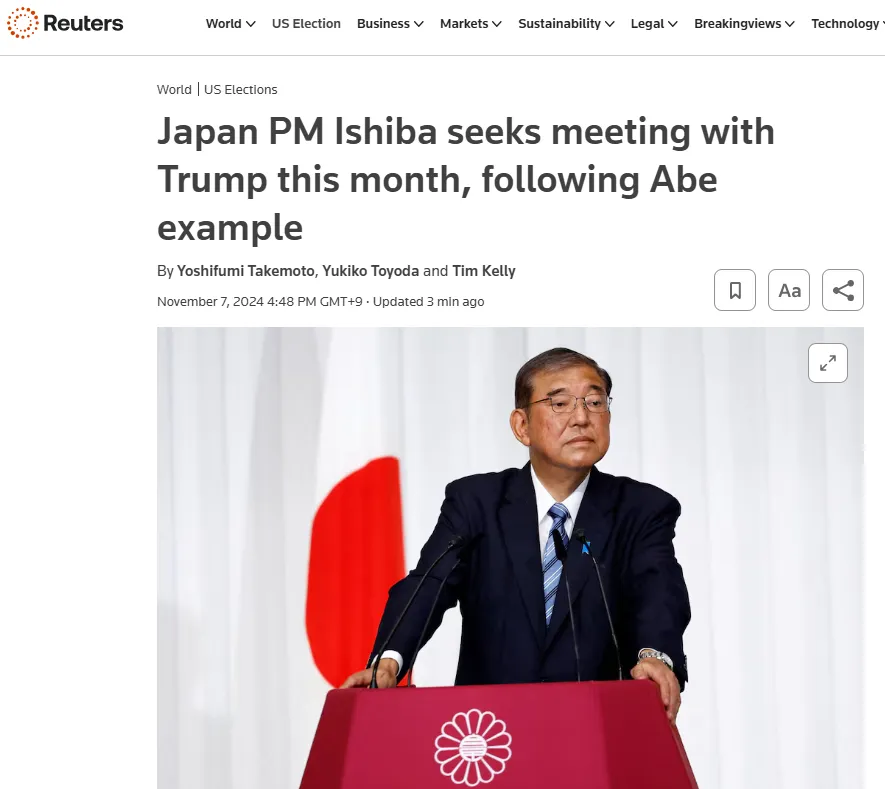 이시바 총리가 트럼프 전 대통령과 조기 회담을 추진하는 것과 관련해 “이는 트럼프 전 대통령 1기 행정부 당시 긴밀한 관계를 맺었던 아베 전 총리를 본받고자 하는 것”이라고 덧붙였다.