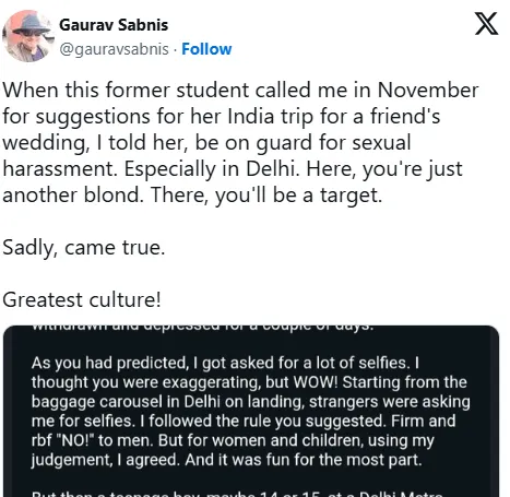또 다른 네티즌은 “내 딸도 인도 여행에서 당혹감을 느꼈다고 한다. 왜 사람들이 눈을 마주치지 않고 가슴만 바라보며 말을 거는지, 왜 마치 물건처럼 같이 사진을 찍겠다고 하는지, 왜 그렇게 많은 사람이 마음대로 만지고, 붙잡으려 하는지 이해할 수 없다고 말했다”고 전했다.