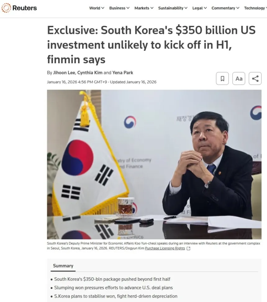 실제로 최근 구윤철 경제부총리가 로이터통신과 인터뷰에서 환율 문제를 언급하며 “올 상반기에 3500억 달러 대미 투자가 본격적으로 시작될 가능성이 크지 않다”고 말했고, 이는 블룸버그통신 등 외신을 통해 대대적으로 보도했다.