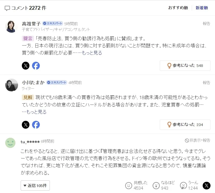 ▲ 일본 최대 포털 야후재팬에 소개된 매춘방지법 개정 관련 기사 댓글 화면. ‘사는 쪽도 처벌해야 한다’는 주장과 음성화 우려, 복지·제도 개선 필요성 등을 둘러싼 찬반 의견이 댓글 2000여 개 쏟아지며 격론이 이어지고 있다. 야후재팬 캡처