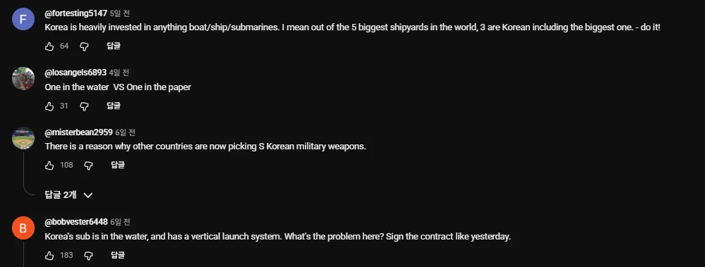 캐나다 최대 방송사 중 하나인 CTV의 최근 기사 아래에는 한국의 잠수함을 사자는 댓글이 다수 달렸다. 네티즌들은 “다른 나라들이 한국 무기를 사는 데는 다 이유가 있다”, “한국 잠수함이 커서 승조원 근무 환경도 좋을 것 같다”, “독일 잠수함은 주문하면 언제 올지 알 수 없다” 등 한국 잠수함에 대한 우호적인 댓글을 쏟아냈다.