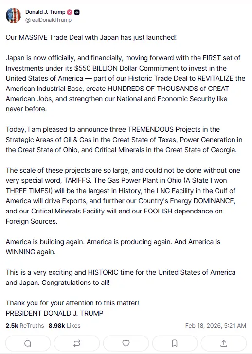 트럼프 대통령은 17일(현지시간) 자신의 소셜미디어를 통해 “일본이 5500억 달러(약 796조원) 규모 대미 투자 약속에 따라 첫 투자 세트를 시작한다”며 “텍사스 석유·가스, 오하이오 발전, 조지아 핵심광물 등 3대 프로젝트를 발표하게 돼 기쁘다”고 밝혔다. 그는 “관세라는 특별한 단어가 없었다면 이런 결과는 나오지 않았을 것”이라며 관세 압박이 투자 결정을 이끌어냈다고 주장했다.