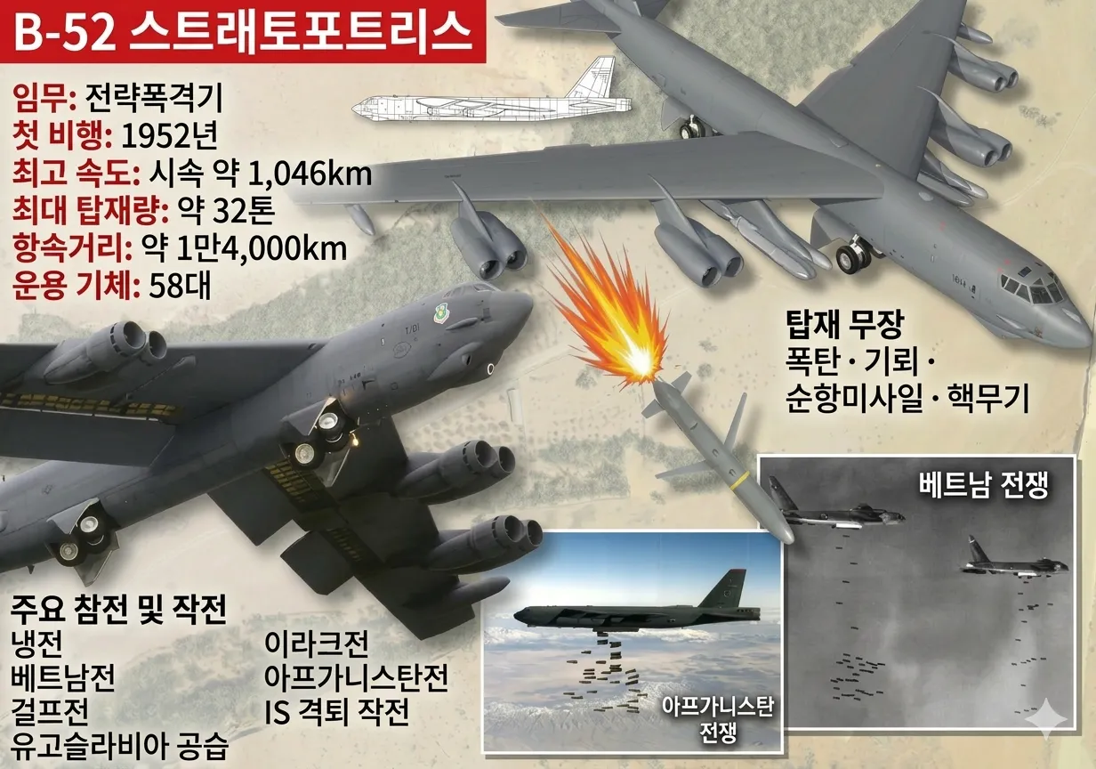 B-52는 1952년 첫 비행을 하고 1955년 실전 배치된 미 공군 대표 전략폭격기다. 이후 여러 차례 개량을 거치며 지금까지도 미군 장거리 타격 전력의 핵심 역할을 수행하고 있다. 이 폭격기는 순항미사일과 정밀유도폭탄, 핵무기 등 다양한 무기를 운용할 수 있는 미 공군의 대표적인 장거리 전략폭격기다.