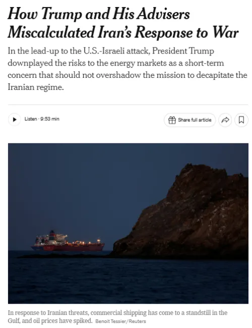 뉴욕타임스 “이번 전쟁은 트럼프의 완전한 오판”호르무즈 해협에서 선박 3척이 잇따라 피격되고 태국 국적의 선박에 화재가 발생하는 등 우려가 현실이 되는 상황에서, 이번 작전이 트럼프 대통령과 행정부의 오판으로 시작됐다는 지적도 나온다.