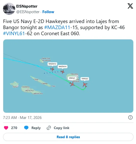 미국 군사 전문 매체 더워존은 17일(현지시간) “전날 밤 포르투갈령 아조레스 제도에 있는 E-2D 항공기들의 모습이 공개됐다”면서 “온라인 항공 추적 데이터에서도 최소 5대의 해당 항공기가 아조레스 제도로 향하는 모습이 확인됐다”고 보도했다.