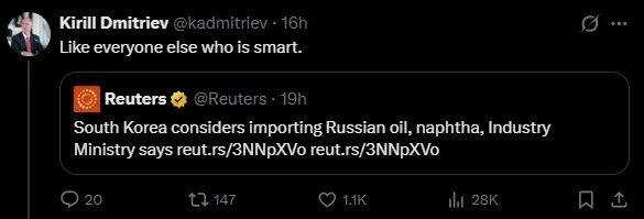 보도에 따르면 키릴 드미트리예프 러시아 해외투자 경제협력 특사 겸 직접투자펀드 대표는 이날 엑스에 한국이 러시아산 원유 수입을 검토 중이라는 외신 보도를 링크하며 “똑똑한 이들은 모두 그렇듯”(Like everyone else who is smart)이라고 적었다.