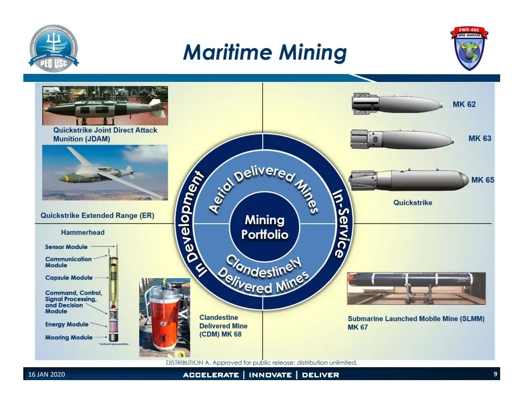 그러나 기뢰는 이란처럼 해군력이 부족한 국가만 사용하는 무기는 아니다. 세계 최강 전력을 자랑하는 미 해군도 이란처럼 다양하지는 않지만 기뢰를 사용한다. 현재 사용하는 기뢰는 항공기용 폭탄을 개조한 퀵스트라이크 계열 항공기 투하형 기뢰와 Mk.67 잠수함 발사 기동 기뢰(Submarine Launched Mobile Mine, SLMM)가 있다. 1987년부터 사용된 Mk.67 SLMM은 Mk.37 어뢰를 기반으로 제작돼 잠수함의 어뢰 발사구를 통해 발사된 뒤 해저면에 부설된다.
