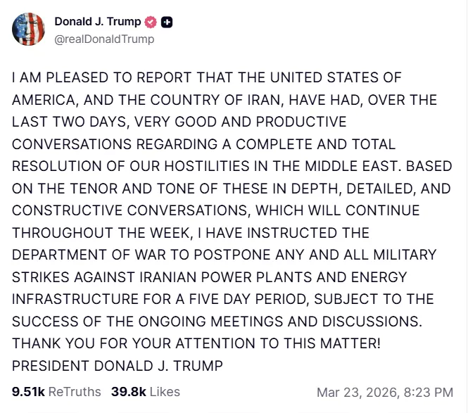 23일(현지시간) 워싱턴포스트와 로이터통신, 가디언 등 주요 외신에 따르면 트럼프 대통령은 이날 자신의 트루스소셜에 올린 글에서 미국과 이란이 지난 이틀 동안 “매우 좋고 생산적인 대화”를 했다고 주장했다. 그는 이런 논의가 이번 주 내내 이어질 것이라며, 이란 발전소와 에너지 인프라를 겨냥한 군사 타격을 5일간 유예하라고 지시했다고 밝혔다. 발표 직후 국제유가는 급락했고 금융시장도 안도 흐름을 보였다.