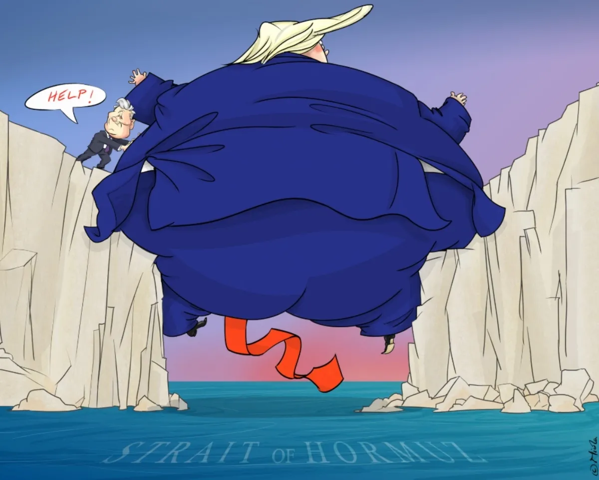 그림 속 배경은 호르무즈 해협이며 몸집이 매우 거대한 한 남성이 해협 통행로를 꽉 틀어막고 있다. 왼쪽에는 그의 옷자락을 잡은 ‘작은’ 남성이 ‘도와줘!’(HELP!)라고 외치고 있다.