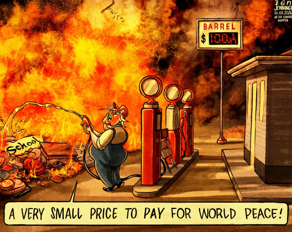 트럼프 대통령의 뒤로는 ‘배럴당 100달러’라고 적힌 가격 표지판이 보이고 그림 아래에는 “세계 평화를 위해 치르는 아주 작은 대가일 뿐이야!”(A VERY SMALL PRICE TO PAY FOR WORLD PEACE!)라는 문장이 적혀 있다.