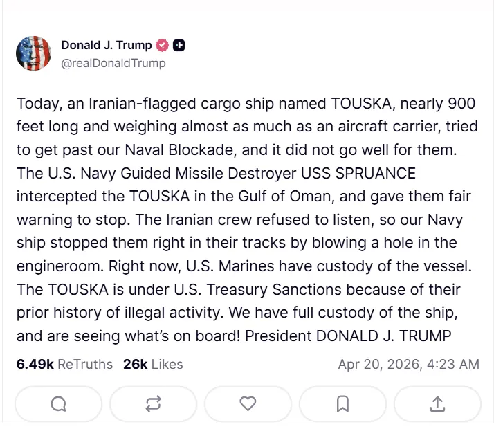 트럼프 대통령도 같은 날 트루스소셜에 “투스카가 우리의 해상봉쇄를 뚫으려 했지만 실패했다”며 “우리 군함이 기관실에 구멍을 내 멈춰 세웠고 지금 미 해병대가 선박을 확보해 내부를 확인하고 있다”고 밝혔다. 월스트리트저널(WSJ)은 이번 조치를 미국의 대이란 봉쇄 시행 이후 무력이 실제 쓰인 첫 공개 사례로 평가했다. 미국은 앞서 이란 관련 선박 20척 넘게 회항시켰지만, 함포를 쏜 뒤 승선해 억류한 것은 이번이 처음이다.