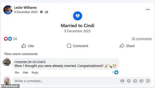 보도에 따르면 그는 지난해 12월 9일 페이스북에 신디라는 여성을 새 아내로 소개하며 결혼 사실을 알렸다. 게시물에는 지인들의 축하 댓글이 이어졌지만, 그중 한 댓글이 눈길을 끌었다.