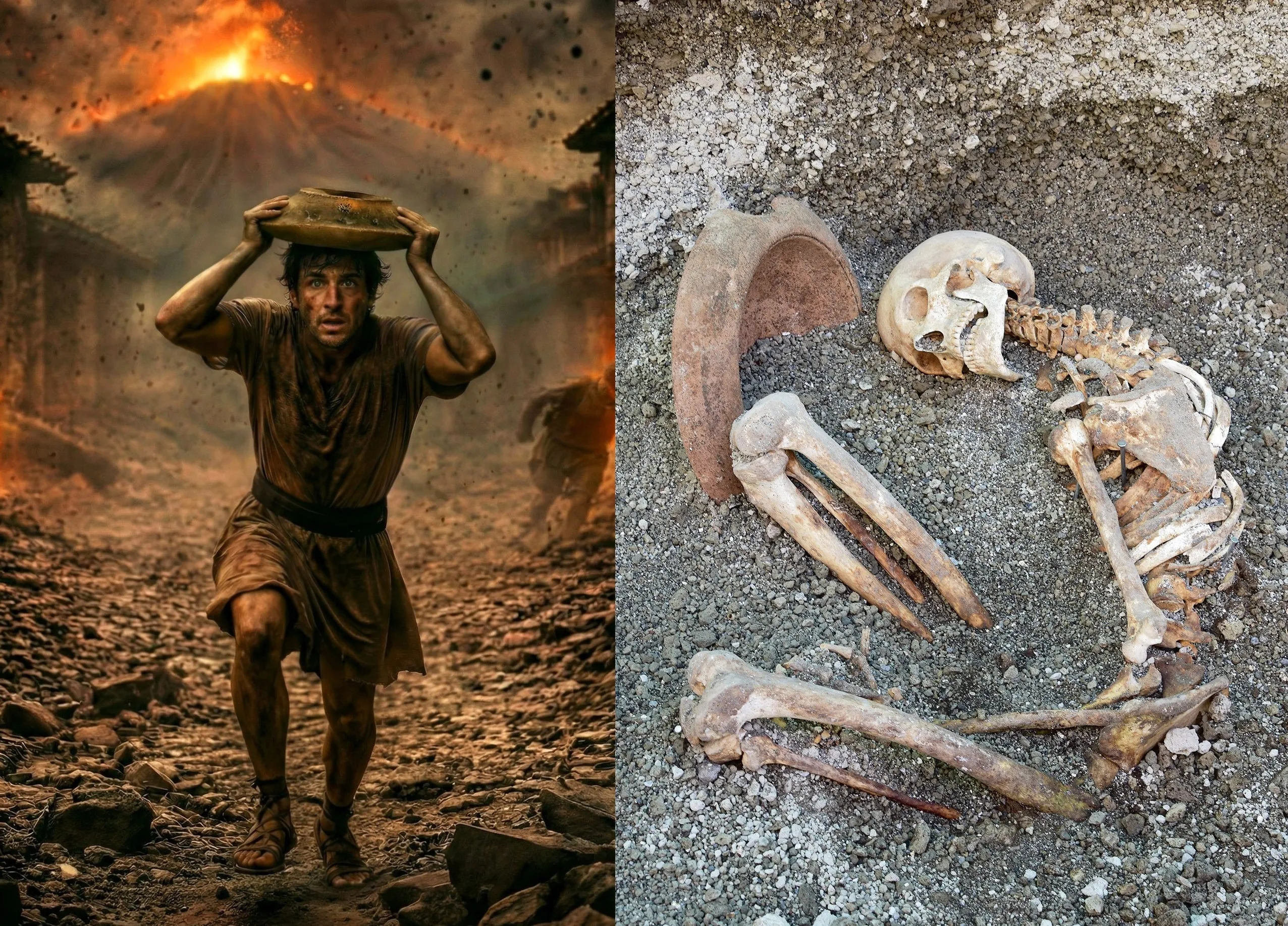 이날 공개된 AI 이미지에는 폭발한 베수비오 화산을 배경으로 한 남성이 커다란 그릇을 머리 위에 들고 몸을 숙이며 도망치는 모습이 담겨있다. 당시 위급했던 상황이 고스란히 표현된 것으로, 이는 실제 유해를 바탕으로 만들어진 것이다. 이 남성의 유해는 최근 도시 남쪽 성문 바깥에서 발굴됐으며, 그 옆에는 방어용으로 사용한 테라코타 절구가 놓여있었다. 또한 남성은 철제 반지와 청동 동전 10개도 가지고 있었는데, 이러한 개인 소지품은 폼페이에서의 일상생활을 엿볼 수 있게 해준다.