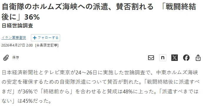 니혼게이자이신문이 TV도쿄와 지난 24~26일 실시해 27일 공개한 여론조사 결과에 따르면 ‘전투 종료 후 파병해야 한다’고 답한 응답은 36%, ‘전투 종료 전부터 파병해야 한다’는 응답은 12%였다. 전쟁 종료 시점과 무관하게 파병에 긍정적인 답변은 48%인 셈이다.